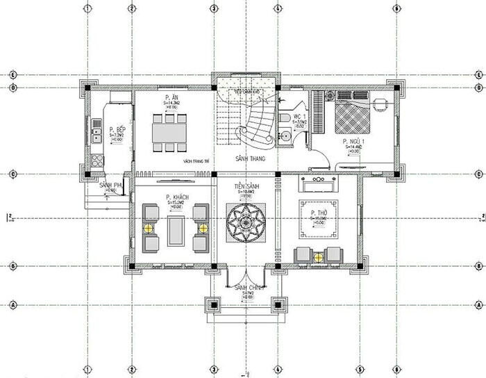 Mặt bằng công năng tầng trệt bao gồm: sảnh chính, sảnh phụ, phòng khách, phòng thờ, phòng ăn, phòng ngủ, bếp, phòng ăn, Wc. Các phòng đều được sắp xếp hợp lí, đảm bảo không gian không bị chồng chéo giữa các phòng.